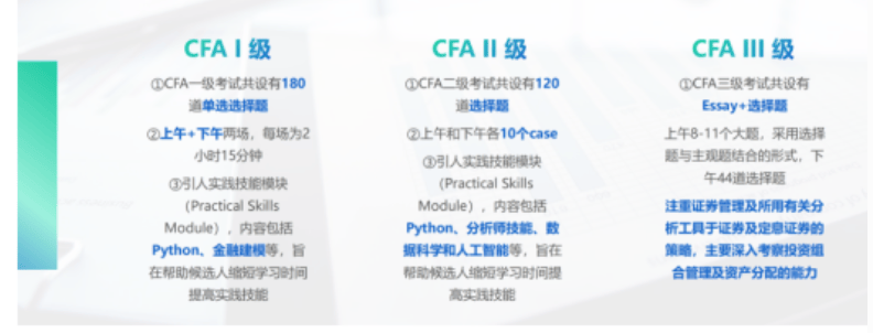 CFA考试一共分为三级,并且考试全英文。一级注重基础知识的广度,二级强调对知识的应用和分析能力,三级则更侧重投资组合管理等实际操作技能和综合知识运用。