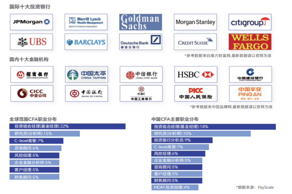 根据CFAInstitute公开的数据,海外主要金融机构都是CFA持证人的雇主:美国银行、加拿大银行、摩根士丹利、JP摩根、德意志银行、汇丰、花旗、瑞信、富国银行、高盛。国内主要金融机构也对CFA人才青睐有加:中国工商银行、中国银行、中国平安、光大、海通证券、国泰君安、四大的中国事务所、红杉资本中国公司。