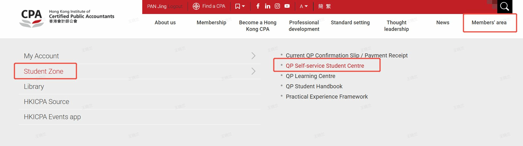 1、上边栏【Member's Area】→【Student Zone】→【QP Self-service Student Centre】