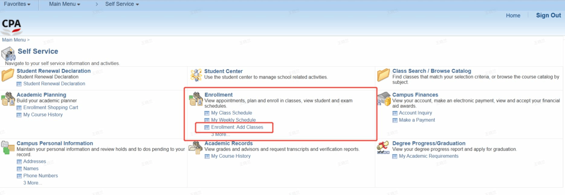 2、进入【QP Self-service Student Centre】后,点击【Enrollment】→【Enrollment:Add Classes】