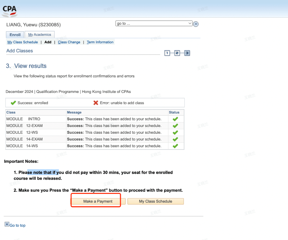 7、报考科目全部选定,信息确认完后,点击【Finish Enrollment】→【Make a Payment】