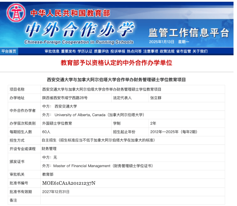 2012年,中国教育部审核批准了西安交通大学与加拿大阿尔伯塔大学国际合作金融财务管理硕士项目。教育部审核批准的意义在于认可通过本项目获取学位的学生与通过境外留学获取学位的学生具有同样身份。学位证书可在中国教育部留学服务中心认证。
