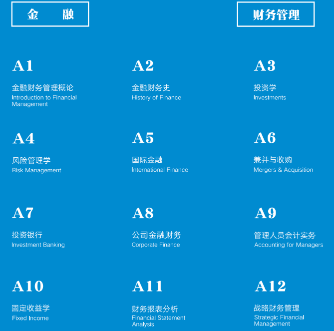 项目要求完成12门课程(39学分)主要集中在金融和财务管理相关。课程注重从CFO角度上的思考企业整体战路的金融和财务管理职能,将会有相当多的融合主题。